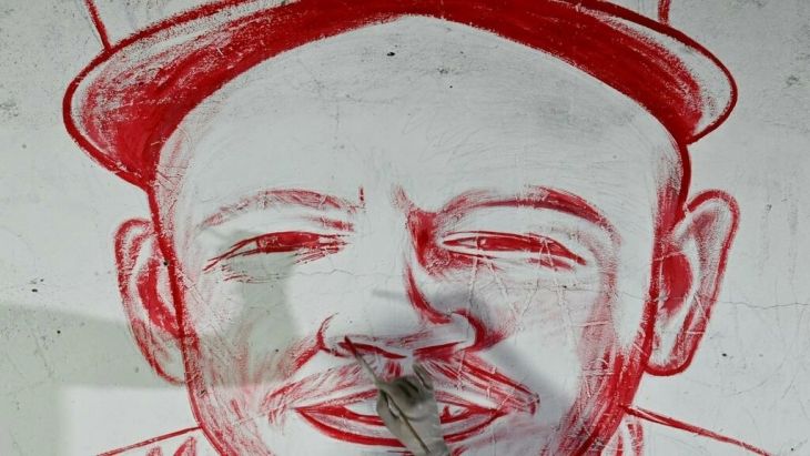 Con la sangre mezclada con pigmento y pintura, el artista de 29 años comienza a plasmar el rostro del rapero y activista puertorriqueño Residente, y la "Paloma de la paz" del pintor español Pablo Picasso.