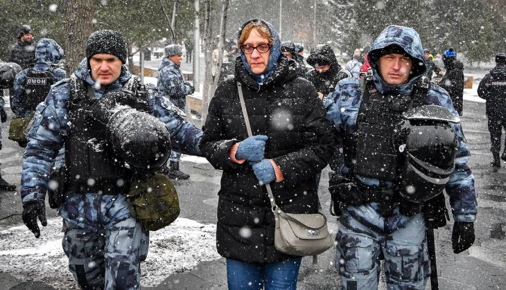 En Moscú, una sentada contra la intervención militar rusa en Ucrania estaba prevista para las 11 horas GMT en el parque Zariadié, cerca del Kremlin. Poco después, la policía comenzó a arrestar a personas sentadas en los bancos del parque, en plena tormenta de nieve.