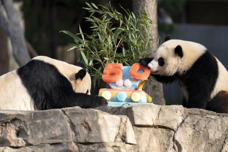 Los inquilinos más famosos del Zoológico Nacional en Washington, dos pandas, tuvieron un animado desayuno delante de una muchedumbre encantada el sábado, cuando devoraron un pastel helado en celebración de los 50 años de un acuerdo del zoológico con el gobierno chino para el intercambio de estos animales.