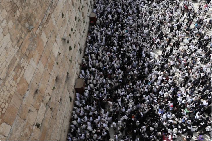 El rito de hoy en el Muro de los Lamentos siguió a los festejos del fin de semana por el inicio de Pésaj, que este año ha coincidido con el Ramadán y las celebraciones de la Semana Santa católica.