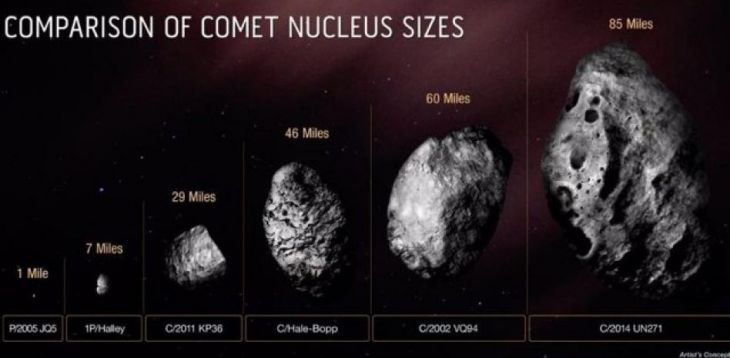 Un análisis de científicos de la NASA con el telescopio Hubble del cometa 2014 UN271, que se adentra en el Sistema Solar desde la nube de Oort, revela que su núcleo abarca unos 135 kilómetros y es más negro que el carbón.
