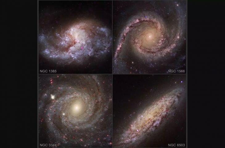 Las cuatro galaxias que se muestran en el gráfico se encuentran entre las 29 galaxias del estudio que mostraron evidencias de agujeros negros en crecimiento cerca de sus centros. Los rayos X del Chandra (azul) se han superpuesto a las imágenes ópticas del Telescopio Espacial Hubble de la NASA de las galaxias NGC 1385, NGC 1566, NGC 3344 y NGC 6503.