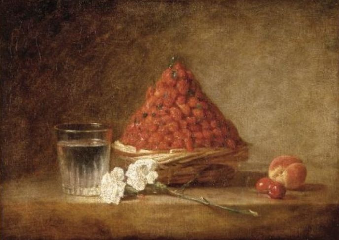 Las autoridades consideran que esta pintura, en la que se ve una pirámide de fresas en una cesta sobre una mesa difuminada junto a un vaso, dos claveles, un melocotón y unas cerezas, es una "obra magistral" de Chardin (1699-1769).