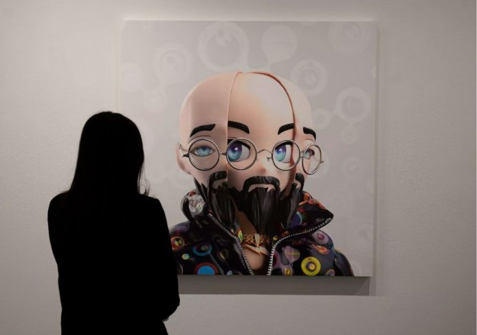 Y después se refirió a la parte más novedosa, un grupo de pinturas y esculturas físicas basadas en sus modelos de arte digital en NFT, con avatares de personajes de anime que forman su serie Clone X y flores pixeladas de estética "superflat" (superplano), de la que es abanderado.