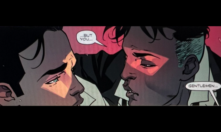 Batman: The Knight #5 coloca a Wayne a punto de besar a Anton, sin embargo, el encuentro no se consuma porque son interrumpidos por una mujer.