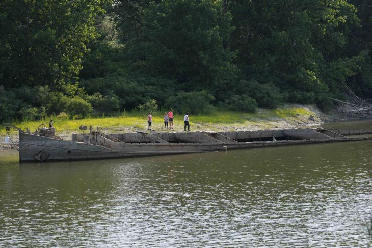 "Es la primera vez que podemos ver esta barcaza", dijo el ciclista aficionado Raffaele Vezzali mientras se bajaba de los pedales para contemplar el oxidado barco. Pero Vezzali sólo estaba parcialmente sorprendido, ya que sabía que la falta de lluvias invernales había provocado que el río alcanzara niveles mínimos históricos.