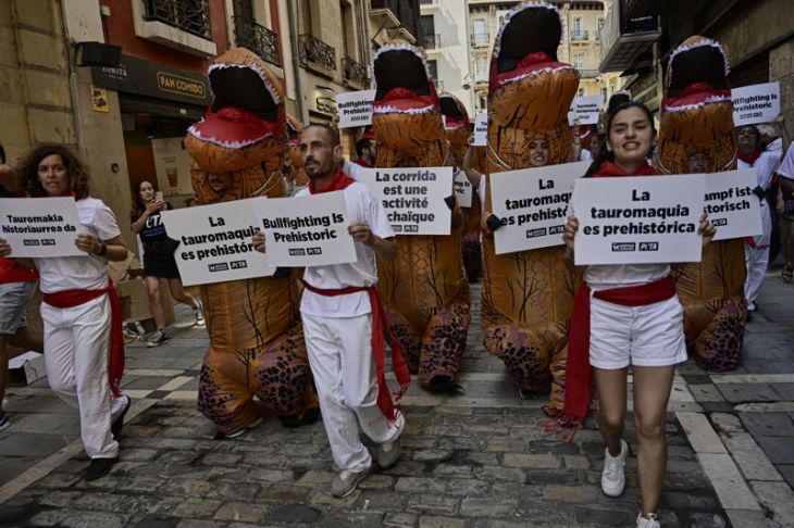 Decenas de defensores de los animales disfrazados de dinosaurios fueron perseguidos el martes por otros de sus compañeros a través de las calles de la ciudad española de Pamplona al escenificar una protesta contra la crueldad animal en los mundialmente famosos encierros de toros de San Fermín.