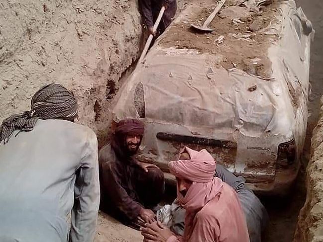La Toyota Corolla blanca fue enterrada en el jardín de un pueblo de la provincia de Zabul, en el sudeste de Afganistán, por el responsable talibán Abdul Jabbar Omari, que ordenó fuera desenterrada esta semana.
