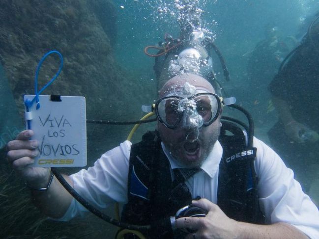 Una pareja española celebró su boda a seis metros bajo el agua en la reserva marina de Cabo de Palos-Islas Hormigas, en Murcia, España, gracias a un club de buceo que cumplió el deseo de los novios.