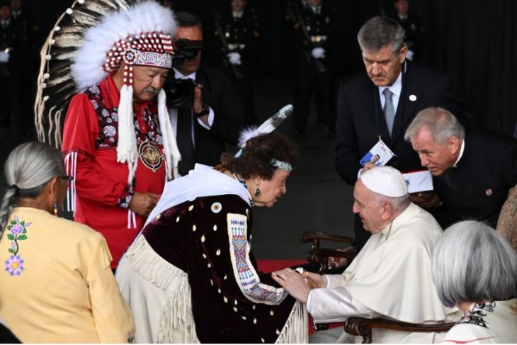 El arrepentimiento del Sumo Pontífice de mil 300 millones de católicos fue recibido con aplausos por una multitud de los pueblos originarios Primeras Naciones, Metis e Inuit congregada en Maskwacis, en la occidental provincia de Alberta, donde niños indígenas fueron sacados de sus familias y sometidos a lo que se considera un "genocidio cultural".
