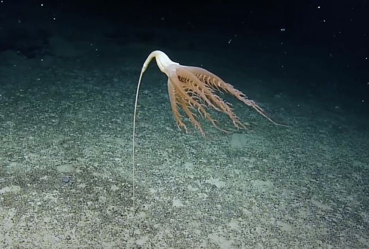 Exploradores que realizan investigaciones a bordo del barco E/V Nautilus encontraron a 2 mil 994 metros de profundidad un ejemplar de Solumbellula monocephalus, una extraña especie que parece una flor con tentáculos.