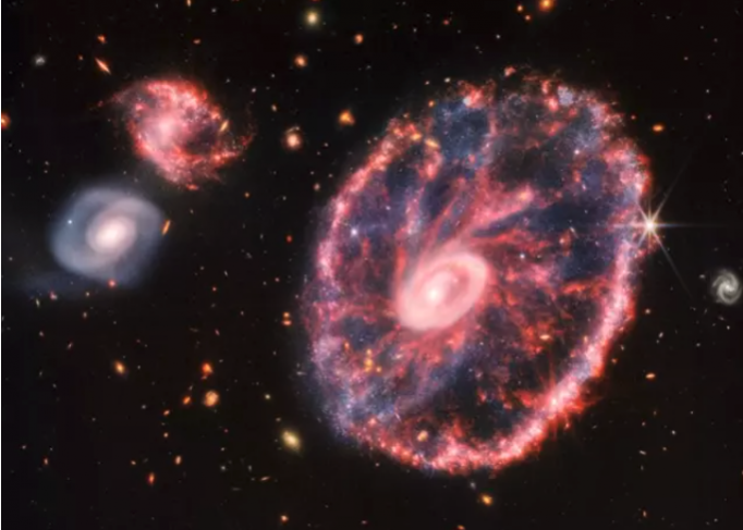 La poderosa mirada infrarroja de Webb produjo una imagen detallada de Rueda de Carro (Cartwheel en su denominación en inglés) y dos galaxias compañeras más pequeñas en un contexto de muchas otras galaxias. Esta imagen proporciona una nueva vista de cómo ha cambiado Rueda de Carro durante miles de millones de años.