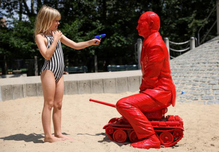 Colomina puso al mandatario sobre un pequeño tanque de juguete en un parque infantil de Central Park y la respuesta de los neoyorquinos a la figura de Putin "fue patadas, puñetazos y puños de arena en la cara", explicó en un correo electrónico.