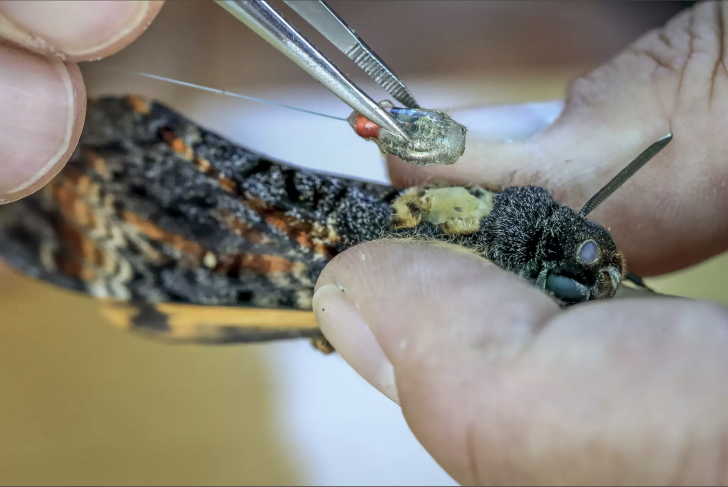 En el MPI-AB de Constanza (Alemania), el equipo crió orugas hasta la edad adulta en el laboratorio para asegurarse de que los individuos fueran ingenuos. Cuando las polillas emergieron como adultas, se les fijaron etiquetas de radio que pesaban 0.2 gramos, menos del 15 por ciento del peso corporal de los adultos. "Las polillas probablemente comerían más peso que eso en una noche, así que estas etiquetas son extremadamente ligeras para los insectos", dice Menz.
