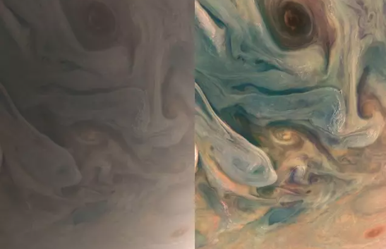 La NASA destaca que esto revela algunos de los aspectos más "intrigantes" de la atmósfera de Júpiter, incluida la variación de color que resulta de la diferente composición química, la naturaleza tridimensional de los vórtices giratorios de Júpiter y las pequeñas y brillantes nubes emergentes que se forman en las partes más altas de la atmósfera.