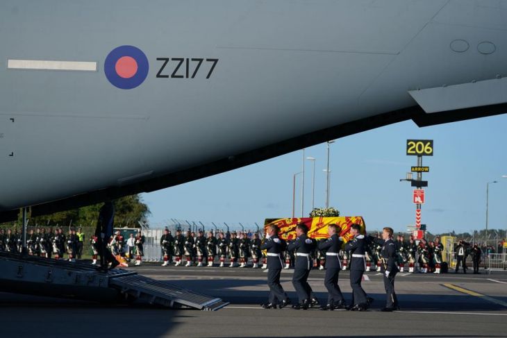 Un avión militar C-17 Globemaster con el féretro de la reina aterrizó en Northolt, una base de la Real Fuerza Aérea ubicada en el oeste de Londres aproximadamente una hora después de que partió de Edimburgo. La primera ministra británica, Liz Truss; el secretario de Defensa, Ben Wallace, y una guardia militar de honor aguardaban en la base aérea.