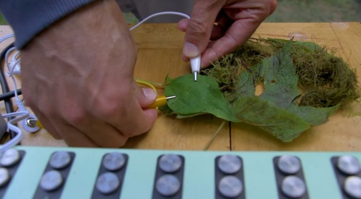 Tarun conecta cables a hojas, flores y todo tipo de plantas para que las señales eléctricas sean registradas en su equipo y se manifiesten en sonidos del sintetizador.