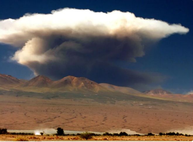 Según reportes preliminares difundidos en medios locales, una fuerte erupción seguida un extenso hongo de humo se registró frente a la pequeño pueblo de Talabre, llamando la atención de los habitantes de la desértica zona.