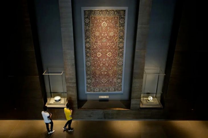 Una esmeralda inscrita para un emperador mogol. Una alfombra de lana anudada del período Safavid. Una cortina de la era otomana, intrincadamente bordada con hilos de metal, que formaba parte de la cubierta de la Kaaba, la estructura en forma de cubo en La Meca que los musulmanes consideran la "casa de Dios" metafórica.
