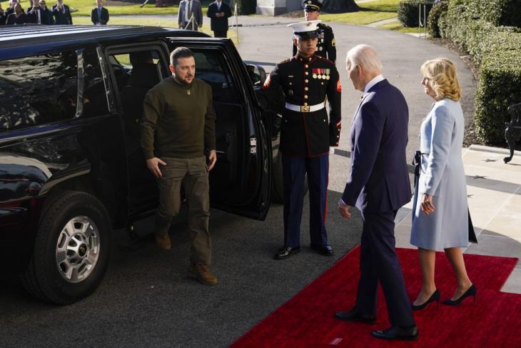Biden y la primera dama Jill Biden recibieron a Zelensky, quien vestía un atuendo informal verde militar. Estrechó la mano de Biden antes de dirigirse a la Oficina Oval, donde después se dirigieron a los medios; luego acudió al Congreso.