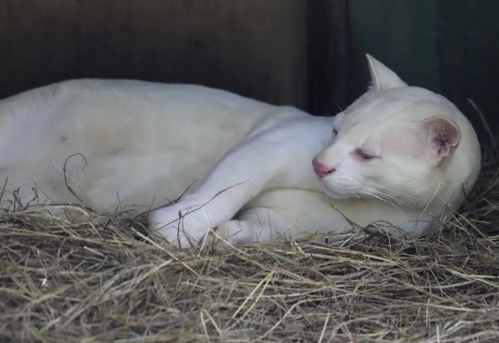 La felina, considerada “extremadamente inusual”, alcanzó la edad adulta y pesa 12.8 kilogramos. Los ocelotes suelen tener el pelaje pardo, ser carnívoros y cazadores, sin embargo, la felina albina dada su mutación genética recesiva no pudo ser liberada a la vida silvestre por su dificultad para camuflarse y ceguera.
