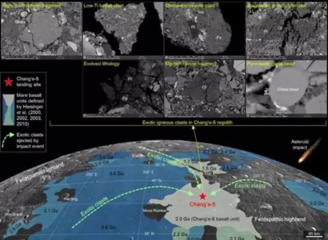 Los investigadores -profesores Zeng Xiaojia, Li Xiongyao y Liu Jianzhong, del Instituto de Geoquímica de la Academia China de Ciencias (IGCAS)-, asociaron estos clastos ígneos exóticos con materiales expulsados por impacto de otras regiones de la Luna, a más de 50-400 kilómetros de distancia de la zona de muestreo de Chang'e-5.