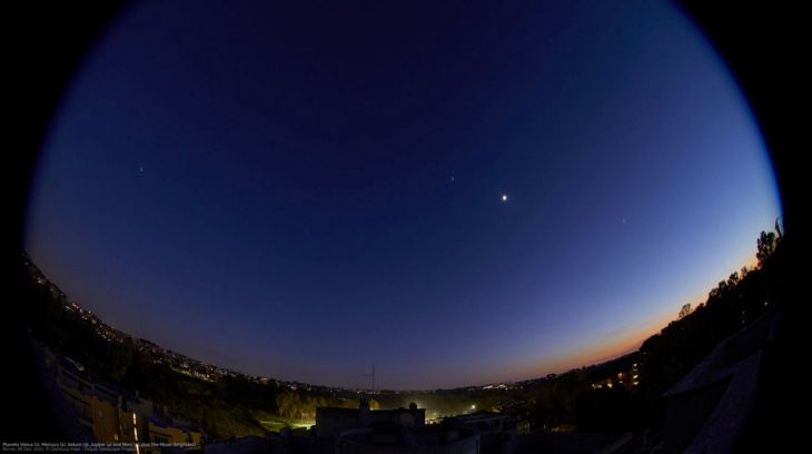 Para lograr captar el momento, Masi eligió dos lentes de ojo de pez con capacidad panorámica extrema para capturar todos los planetas del sistema en un mismo encuadre. En los minutos siguientes a la puesta del Sol, podían percibirse a simple vista la Luna, Marte, Júpiter y Venus, alineación a la que pronto se sumó Saturno.