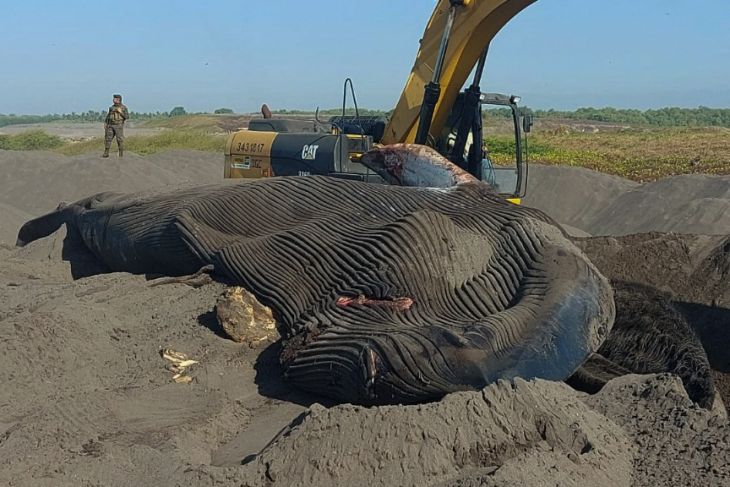 Fotografías del Conap mostraron el momento en el que la ballena fue enterrada en la arena con una máquina excavadora.