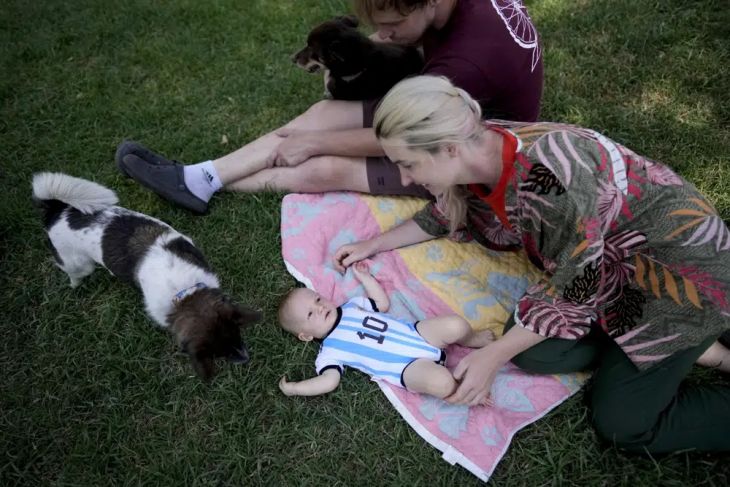Alla Prigolovkina y su esposo Andrei Ushakov aguardaron que el sol les diera algo de tregua para dar un paseo junto a su pequeño bebé Lev Andrés por un parque de la provincia de Mendoza, en el oeste Argentina. La pareja rusa, con su hijo y sus perros Cometa y Santa, saluda amablemente a sus vecinos antes de recostarse en una manta sobre el césped, como si esa hubiese sido siempre su realidad.