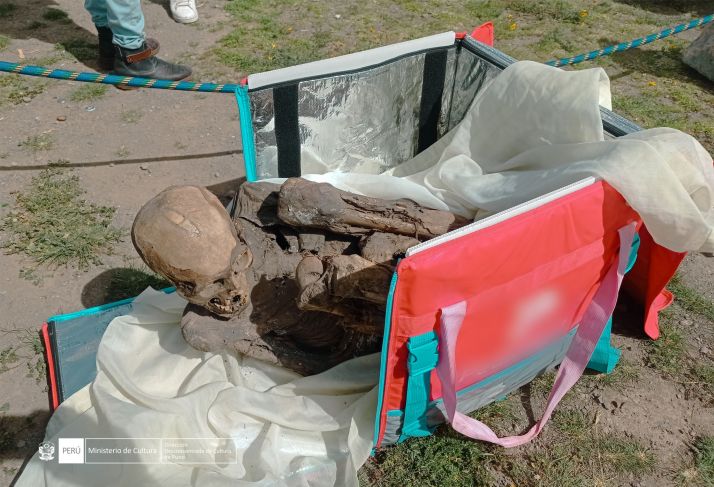 Policías que realizaron una intervención porque tres jóvenes estaban consumiendo bebidas alcohólicas en un mirador de Perú, encontraron una momia al interior de una mochila térmica de una empresa repartidora de comida.