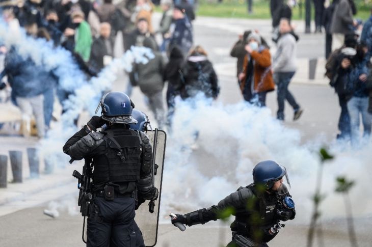 Casi dos horas después del inicio de la marcha, en la que se escucharon eslóganes contra "el autoritarismo" de Macron, hubo quema de contenedores y levantamiento de barricadas, que provocaron cargas de la policía, que empleó gas lacrimógeno en respuesta al lanzamiento de proyectiles por algunos manifestantes.