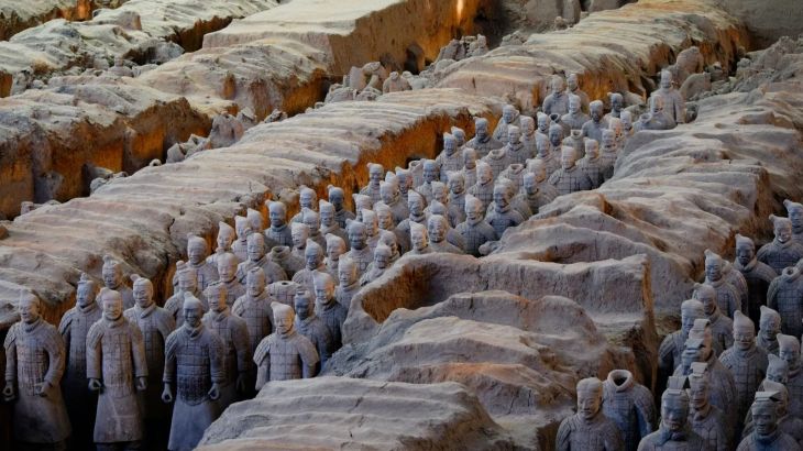 Los Guerreros de Terracota son un conjunto de más de 8.000 figuras de soldados y caballos. Su hallazgo se produjo en 1974 durante la implementación de un programa de abastecimiento de agua. Actualmente, los Guerreros se encuentran dentro del Mausoleo de Qin Shi Huang.