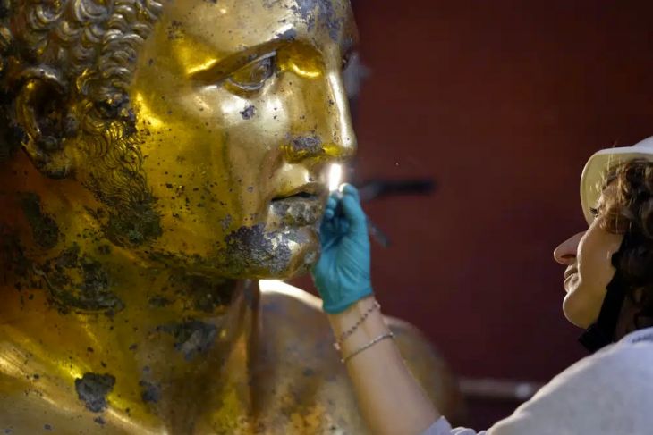 El entierro protegió el dorado, pero también provocó que se acumulara suciedad sobre la estatua, que Baltera dijo que es muy delicada y laboriosa de quitar. “La única manera es trabajar con precisión con lupas especiales, quitando todas las pequeñas incrustaciones una por una”, señaló.