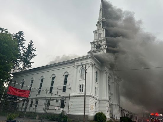 La Primera Iglesia Congregacional en Spencer se incendió el viernes por la tarde, cuando una tormenta se movía por el área. El video mostró la caída del campanario mientras el edificio estaba envuelto en llamas.