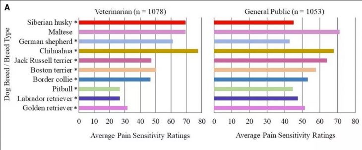 En un estudio, realizado por un grupo de investigadores de la Universidad Estatal de Carolina del Norte, Estados Unidos, se analizó un total 149 perros adultos, machos y hembras, agrupados de acuerdo a cómo los calificaban los veterinarios y el público en general en términos de sensibilidad al dolor: alta (chihuahua, pastor alemán, maltés, husky siberiano); media (border collie, boston terrier, jack russell terrier); o baja (golden retriever, pitbull, labrador retriever).