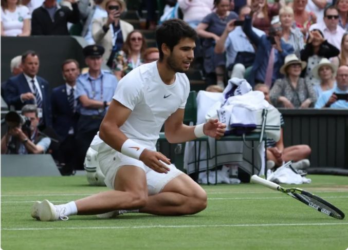 En una tarde histórica, Djokovic empezó la final como la acabó, hincando la rodilla. En el primer juego, se cayó al suelo, una predicción del final del encuentro, pero no de lo que pasaría a continuación, porque el serbio barrió su patio particular en un primer set que hizo exhibición de su vasta experiencia aquí. Con Alcaraz nervioso, Djokovic se puso a pasar bolas desde el fondo, a no fallar, a desesperar al español, sobrecogido por el escenario.