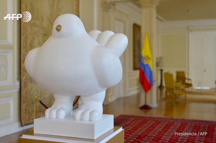 Días antes del acuerdo, Botero le entregó al entonces presidente Juan Manuel Santos (2010-2018) La paloma de la paz, una escultura de bronce de unos 70 centímetros de altura que, con el voluminoso estilo que hizo célebre a su autor, representa una paloma blanca con el pico dorado.