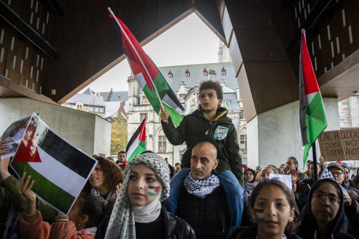 Pobladores de la ciudad medieval de Gante, en Bélgica, se unieron a la ola de repudio mundial contra los ataques de Israel a la Franja de Gaza.