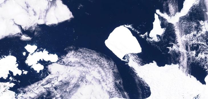 Pero ya no. Recientes imágenes por satélite revelan que el iceberg, que pesa casi un billón de toneladas métricas, se desplaza ahora rápidamente más allá del extremo norte de la Península Antártica, ayudado por fuertes vientos y corrientes.