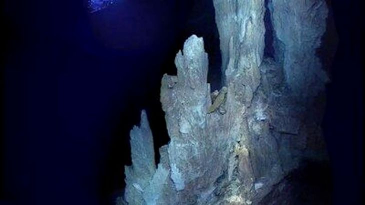 A más de 700 metros bajo la superficie, cerca de la cima de una montaña submarina al oeste de la Dorsal Mesoatlántica, un paisaje irregular de torres se eleva desde la penumbra. Sus paredes y columnas de carbonato cremoso parecen fantasmagóricamente azules a la luz de un vehículo teledirigido enviado a explorar. Su altura varía desde pequeñas pilas del tamaño de una seta hasta un gran monolito de 60 metros de altura. Ésta es la Ciudad Perdida.