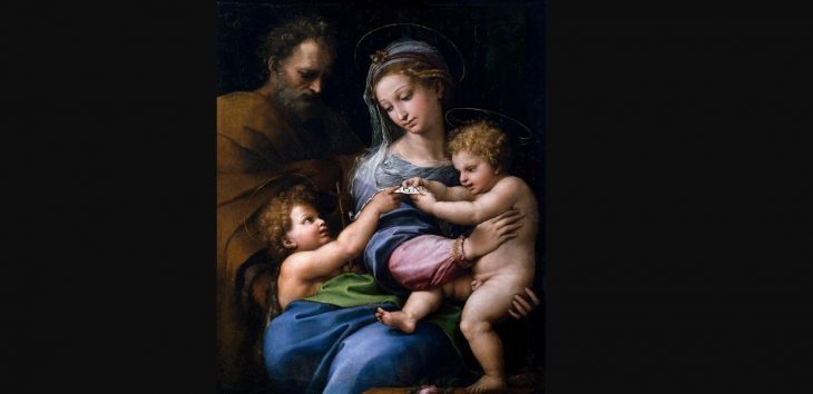 La pintura representa a María, José y Jesús, con el niño Juan Bautista y las dudas sobre su autoría surgieron en el siglo XIX. Los historiadores del arte argumentaron que también debería atribuirse a su taller.