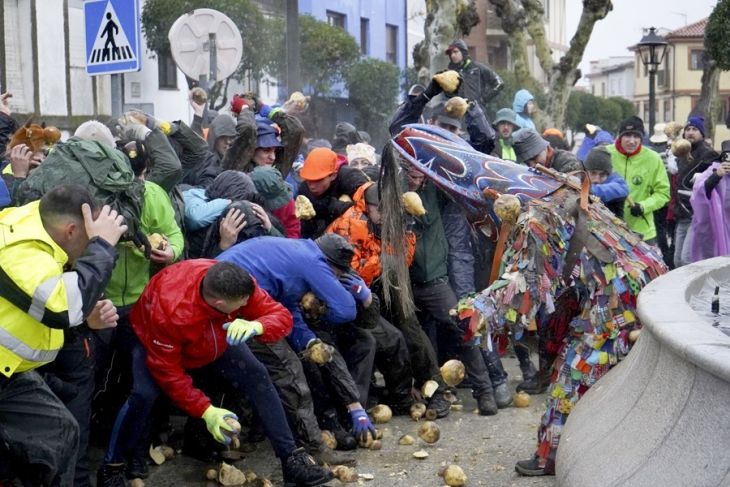 Desde que ha puesto un pie en la calle, Jarramplas ha recibido una intensa lluvia de nabos -hay preparados más de 33 mil kilogramos traídos desde La Vera cacereña, Castilla y León y Portugal- sobre su cuerpo, protegido con una máscara y una armadura de fibra de carbono, a modo de “castigo” infligido por los vecinos.