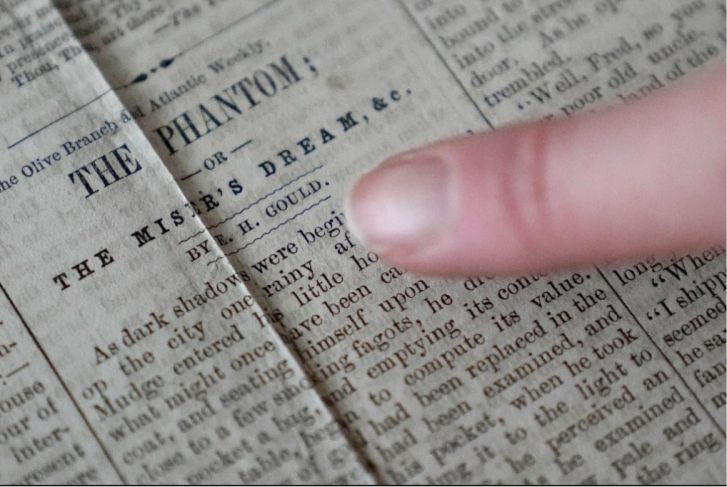 El descubrimiento se dio cuando, como parte de su investigación sobre el espiritismo, y mientras hojeaba periódicos digitalizados de la American Antiquarian Society, encontró una historia titulada El fantasma.