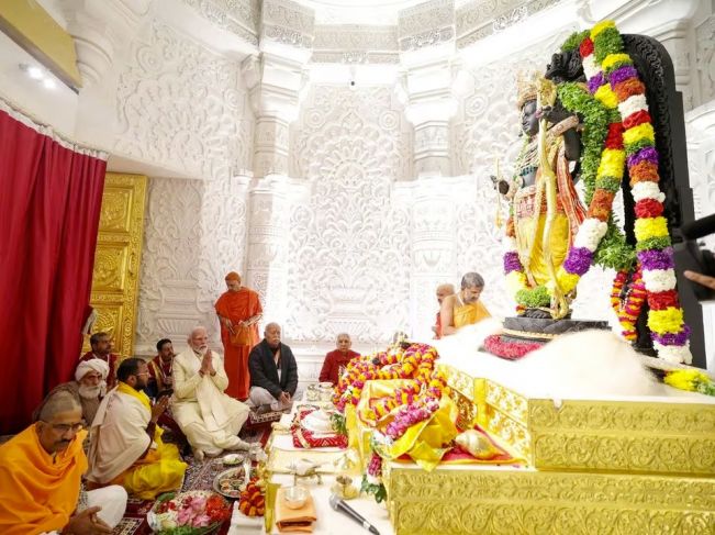 Modi, vestido con un kurta tradicional, dirigió la ceremonia de apertura entre himnos religiosos entonados por sacerdotes hindúes en el interior del templo, donde la semana pasada se instaló una estatua de 1.3 metros de Ram. Un sacerdote sopló en una caracola para conmemorar la inauguración del lugar, y Modi colocó una flor de loto ante la escultura de piedra negra con elaborados adornos de oro, y que sostiene un arco y una flecha doradas. Después se postró ante el ídolo.