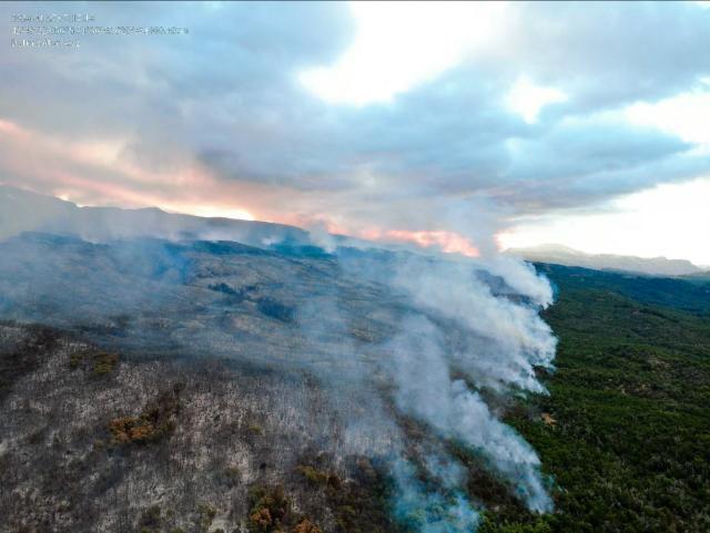 "El fuego continúa activo en todo su perímetro, con sectores de mayor intensidad tanto en la cabeza del incendio como en los flancos y cola con una superficie afectada de unas 5.971 hectáreas aproximadamente", informa en sus redes sociales la cuenta oficial del Parque Nacional Los Alerces.