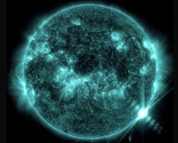 En la misma se aprecia un brillante destello de la parte inferior derecha. La imagen muestra un subconjunto de luz ultravioleta extrema que resalta el material extremadamente caliente en las llamaradas, y que está coloreado en verde azulado, informa la NASA.