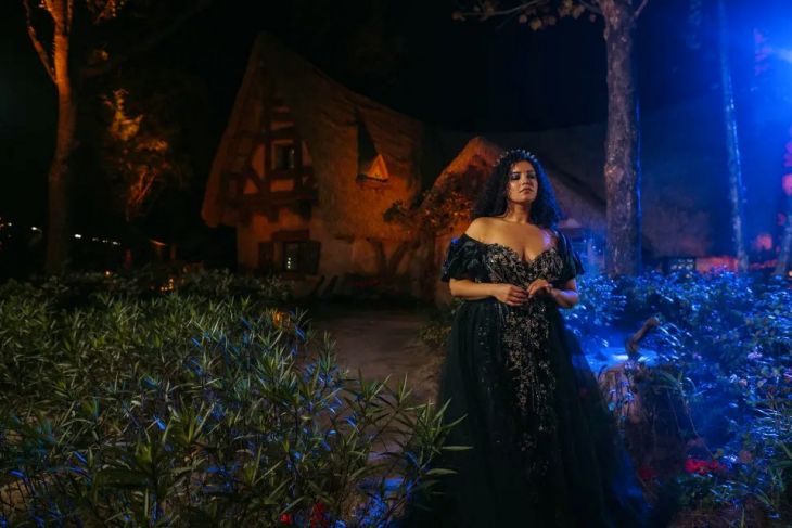 Inspirado en la villana de la película de Walt Disney Blancanieves y los siete enanitos, el vestido en negro, marfil o dorado de la Reina Malvada está decorado con volantes, encajes, adornos florales en 3D y cuentas y lentejuelas delicadamente cosidas sobre tul.