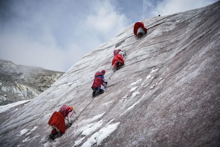 Julia Quispe Tincuta, una indígena aimara boliviana de 35 años, recuerda la primera vez que alcanzó el pico de la montaña Huayna Potosí, donde ella y otras mujeres locales trabajaban cocinando o cargando equipos para que otros escaladores llegaran al campamento base.