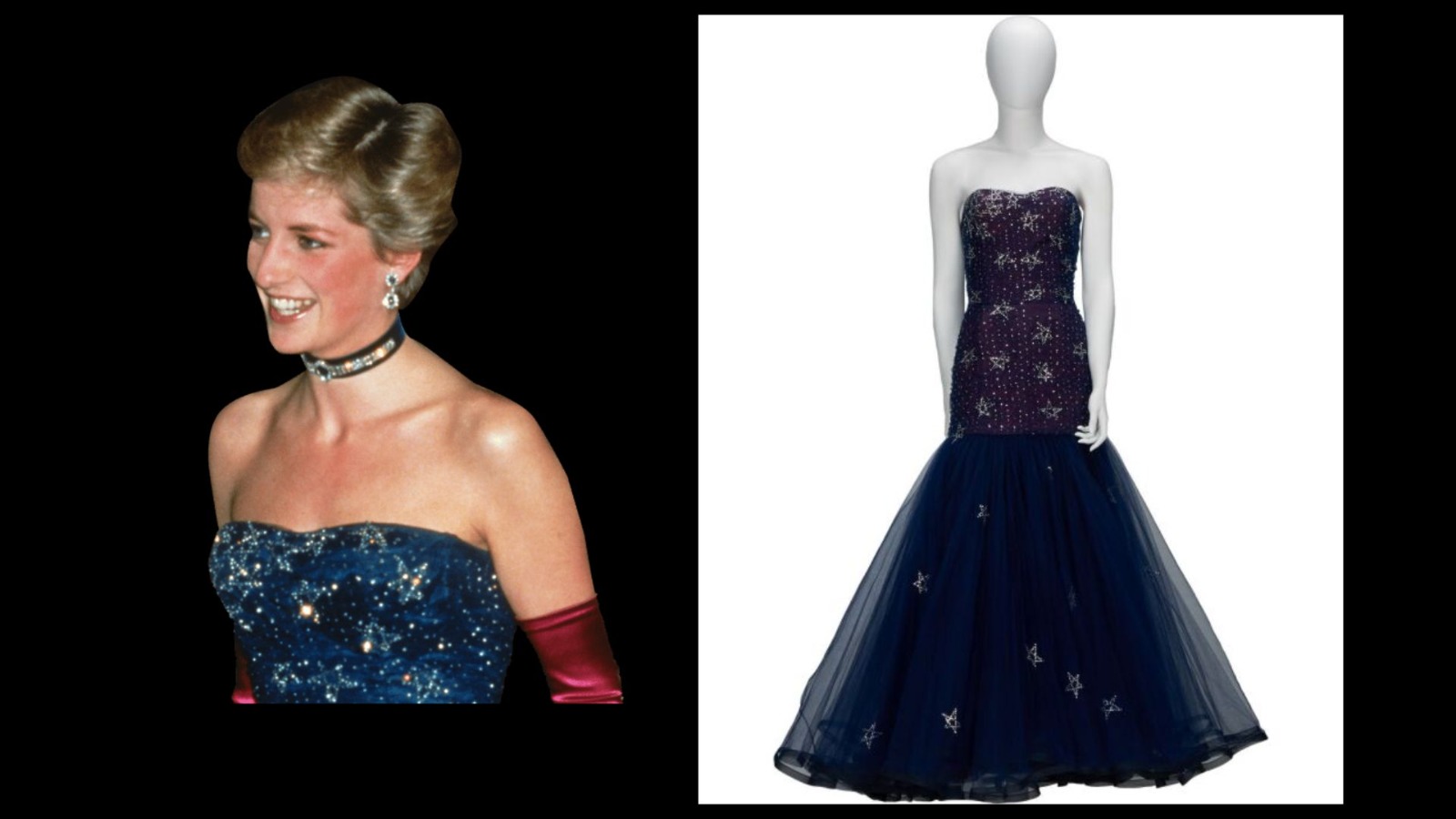 También se subastará un bolso semicircular color violeta, de Rayne, que utilizó en varios eventos benéficos, o el vestido de tul azul decorado con estrellas, de Murray Arbeid, que llevó al estreno de El Fantasma de la Ópera en 1986.
