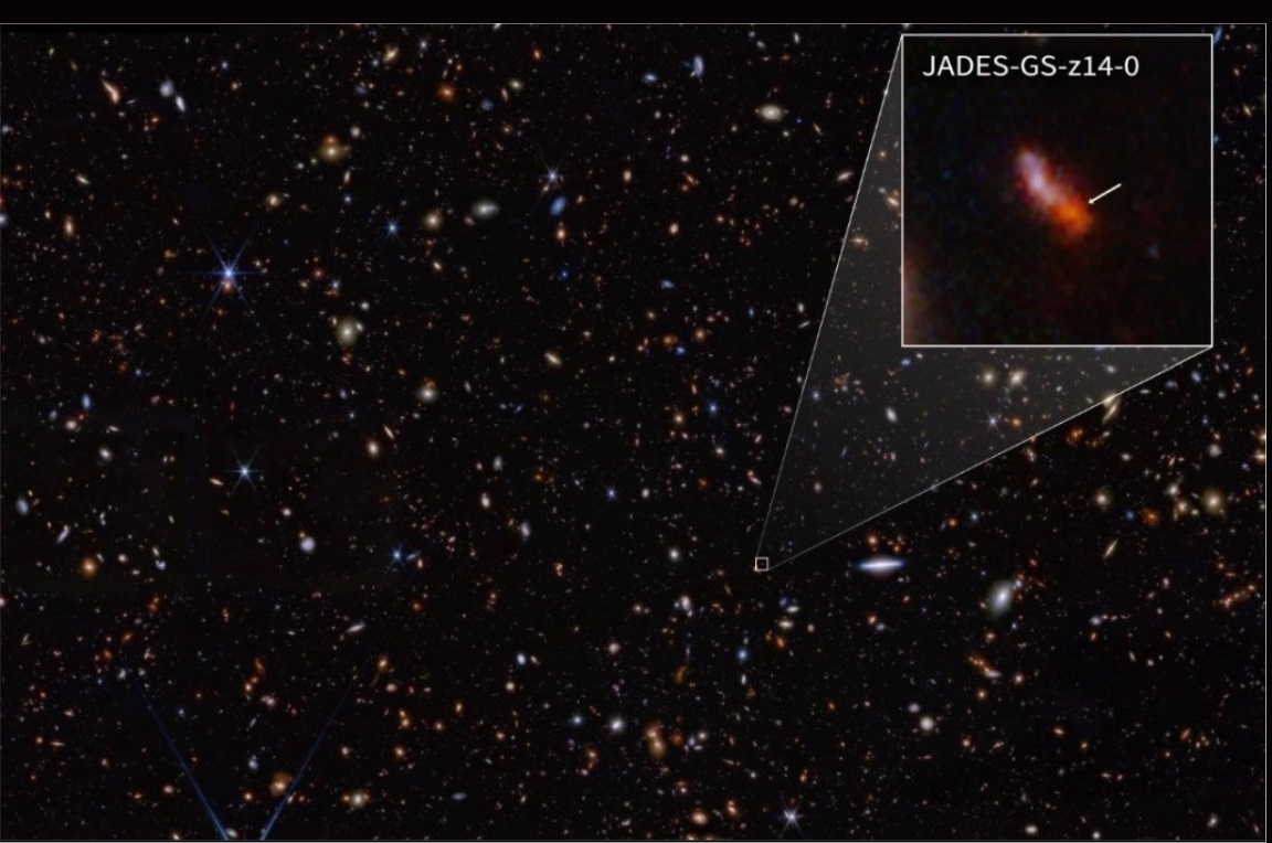 Una de esas galaxias, JADES-GS-Z14-0 (que se muestra aumentada), se determinó en un desplazamiento al rojo de 14,32 (+0,08/-0,20), batiendo el anterior récord de 13,2.